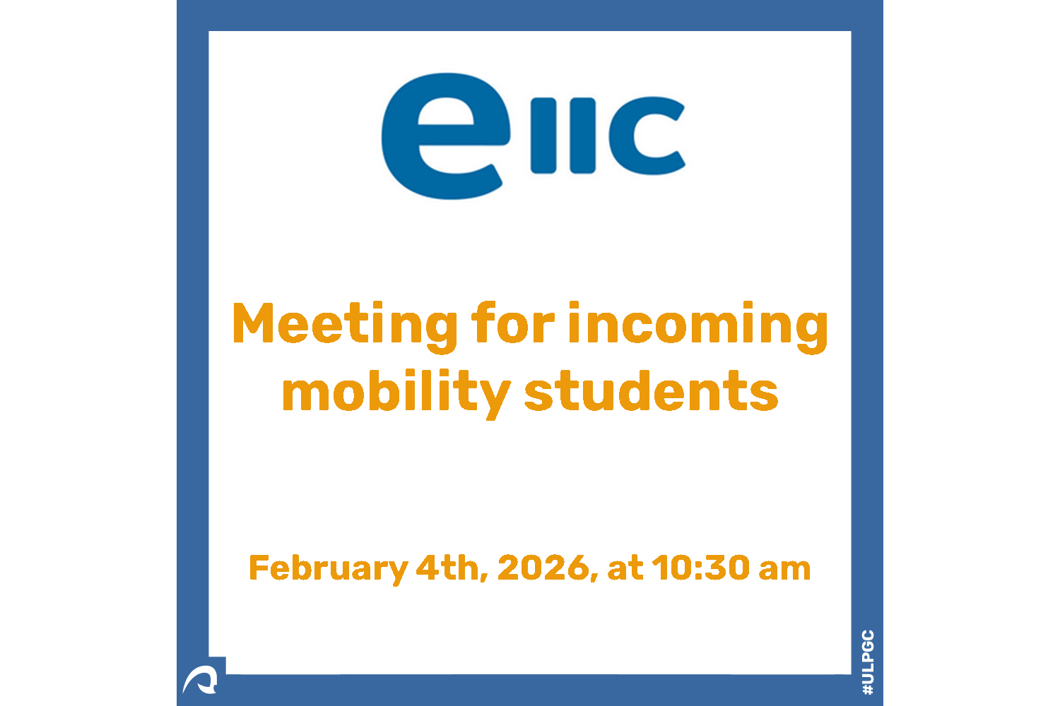 El próximo 4 de febrero de 2026, a las 10:30 h, tendrá lugar en el aula A 113 de la Escuela de Ingenierías Industriales y Civiles (EIIC), la reunión de bienvenida para los estudiantes de movilidad incoming (SICUE y ERASMUS) que van a cursar sus estudios en el 2º semestre en la Universidad de Las Palmas de Gran Canaria. Durante esta breve reunión se explicarán los pasos a seguir para la matriculación en la ULPGC, se procederá a la firma de los certificados de estancia y se atenderán las dudas que puedan surgir. ¡Les esperamos! On February 4th, 2026, at 10:30 a.m., the welcome meeting for incoming mobility students (SICUE & ERASMUS) of the University of Las Palmas de Gran Canaria will take place in Room A 113 of the School of Industrial and Civil Engineering (EIIC). During this short meeting, we will explain the enrolment procedure at ULPGC, sign the certificates of stay, and answer any questions you may have. We look forward to seeing you!