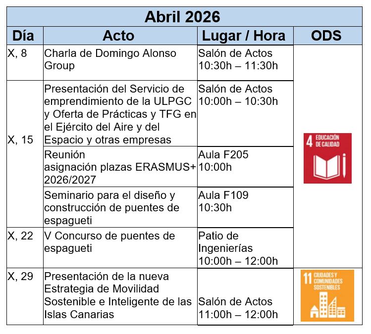 Además, la información detallada de cada actividad se publicará con antelación en la página web oficial de la Escuela: https://eiic.ulpgc.es Y también a través de nuestras redes sociales: Facebook (eiic.ulpgc.es) e Instagram (@eiic.ulpgc).