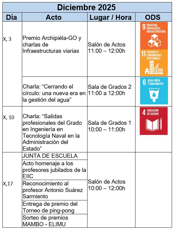 Además, la información detallada de cada actividad se publicará con antelación en la página web oficial de la Escuela: https://eiic.ulpgc.es Y también a través de nuestras redes sociales: Facebook (eiic.ulpgc.es) e Instagram (@eiic.ulpgc).