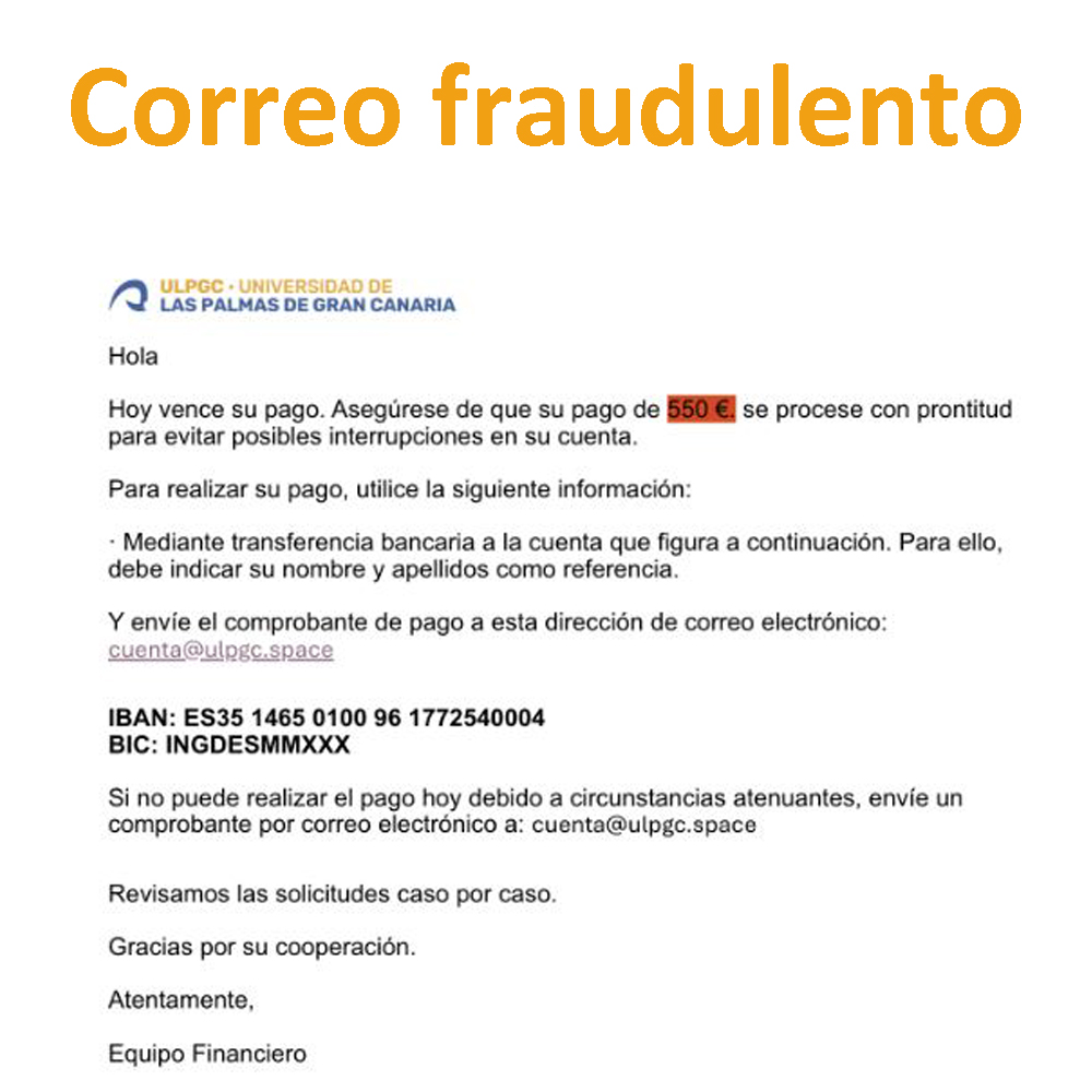Se ha detectado nuevamente el envío de un correo electrónico fraudulento en el que se solicita el pago de 550 € por matrícula mediante transferencia bancaria.