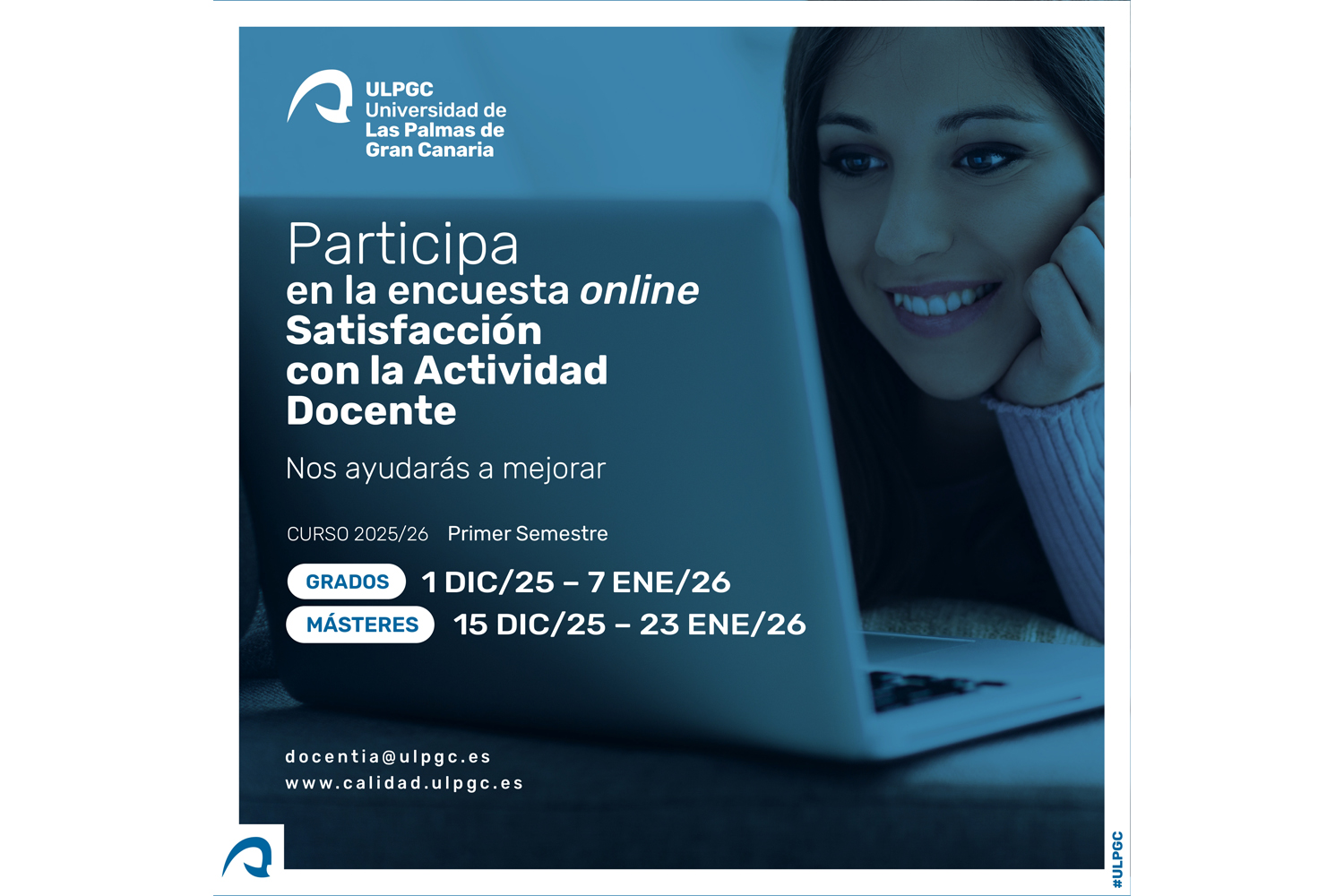 El Vicerrectorado de Títulaciones, Calidad e Innovación Educativa de la Universidad de Las Palmas de Gran Canaria (ULPGC), a través de la Dirección de Calidad Académica y del Gabinete de Evaluación Institucional, abre la convocatoria para la evaluación de la actividad docente por parte del estudiantado de las titulaciones oficiales.