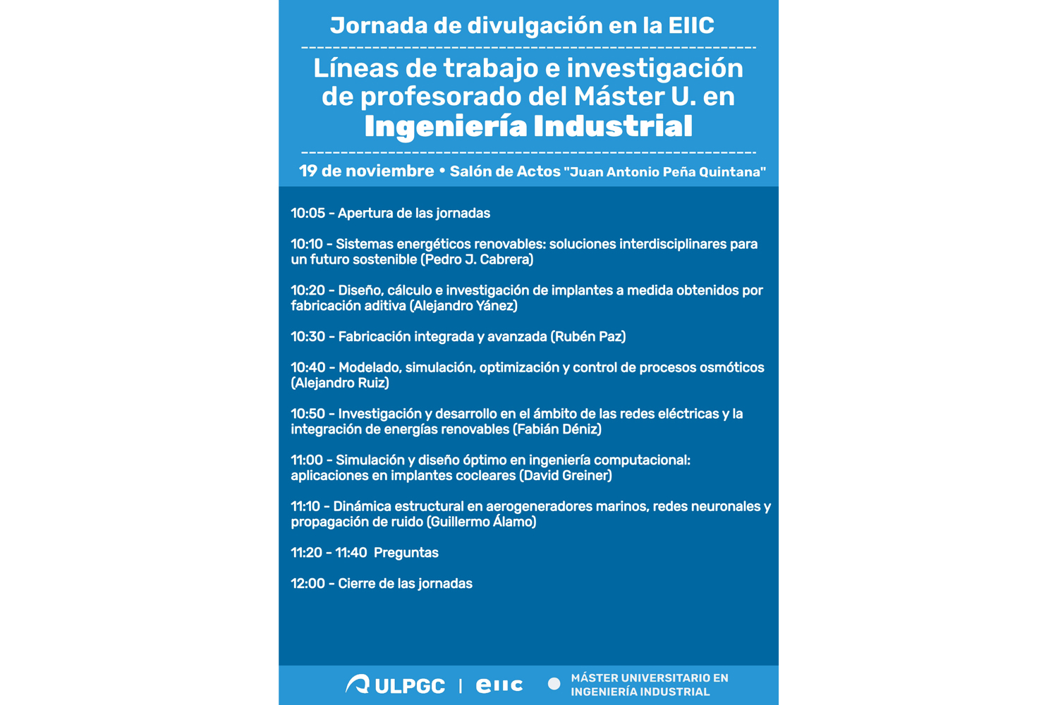 El próximo miércoles, 19 de noviembre, de 10:00 a 12:00 horas, en el Salón de Actos “Juan Antonio Peña Quintana” de la Escuela, se celebrará la Jornada de Divulgación: Líneas de trabajo e investigación del profesorado del Máster Universitario en Ingeniería Industrial (MUII).