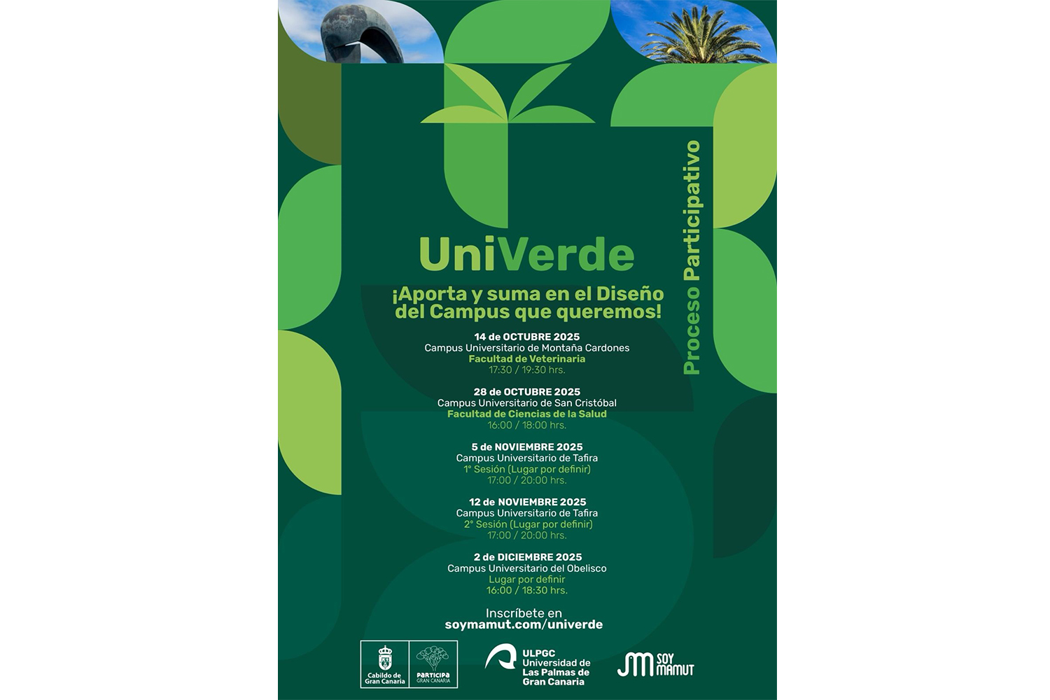 Participa en UniVerde, una iniciativa de la ULPGC y el Cabildo de Gran Canaria, coordinada por la Asociación Cultural Soy Mamut, para repensar y transformar los espacios al aire libre de la Universidad en entornos más verdes, cómodos, accesibles y sostenibles.