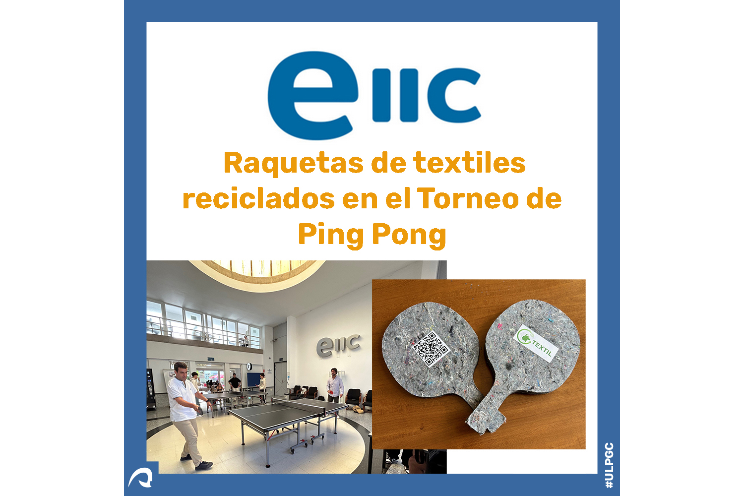 El miércoles día 26, en el torneo de ping-pong de la Escuela, profesores de la EIIC que pertenecen al Grupo de Investigación de Fabricación Integrada y Avanzada (GIFIA) de la ULPGC, nos cedieron unas raquetas fabricadas con textiles reciclados.